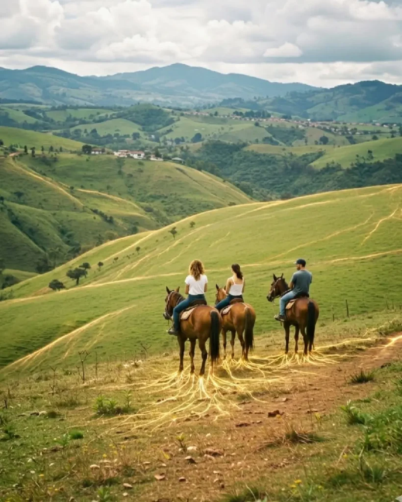 A vivência rural do empreendimento inclui um espaço contemplativo de equinos em curral premium, permitindo aproximação com o ambiente do campo de forma tranquila e sensorial. Complementando essa experiência, trilhas conduzem os sócios por paisagens preservadas da Serra dos Pirineus, oferecendo percursos de contemplação, caminhada e conexão com a natureza.